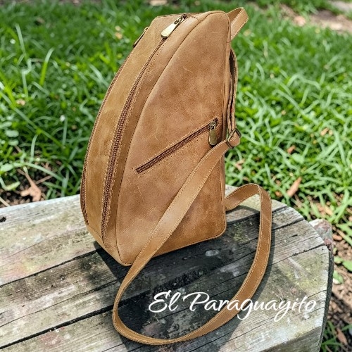 Bolso matero 100% cuero, color café claro modelo tipo morral el que puede ser utilizado tanto de mano como cruzado al cuerpo, con bolsillo interno y externo para llevar tus productos materos.