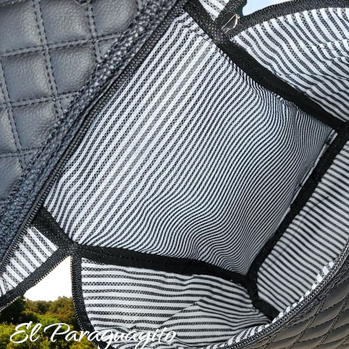 Práctico matero color negro, material ecocuero exterior con diseño semi acolchado y en su interior completamente forrado, su diseño es totalmente adaptable para cualquier situación ya que cuenta con correa desmontable para ajuste tipo morral, con 2 asas para llevar de mano y tirantes traseros para llevar tipo mochila.