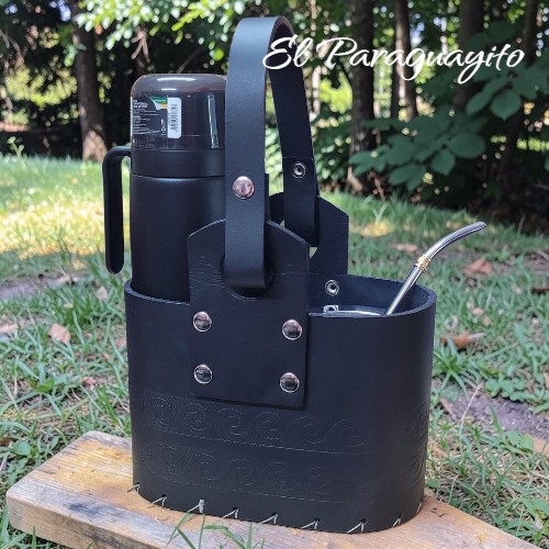 Hermoso canasto matero de cuero grueso 100% tipo sueleta color negro con textura lisa y un diseño único que lo caracteriza , manillas y correa de cuero del mismo color, de 2 compartimientos y separación de cuero en medio.