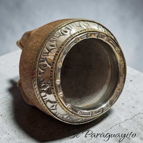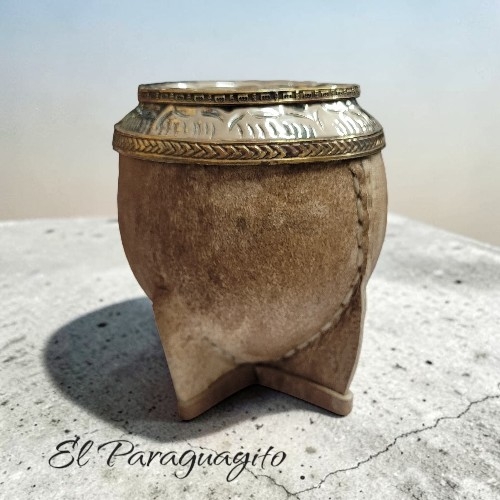 Mate Torpedo Imperial Uruguayo de calabaza pulida forrado en cuero crudo de pelo corto, de excelente terminación, su virola es de alpaca y cintas de bronce la cual es sinselada de forma totalmente artesanal.